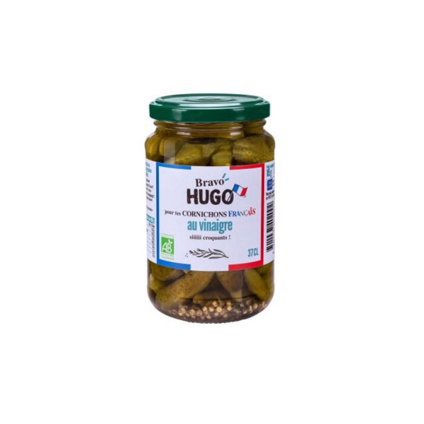 Ingrédients : Cornichons* (France), eau, vinaigre d'alcool*, vinaigre de vin blanc*, sel de Camargue, graines de moutarde*, estragon* 0,4%. *Ingrédients issus de l'agriculture biologique
