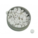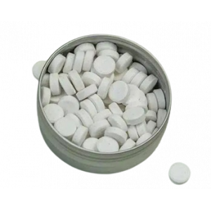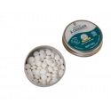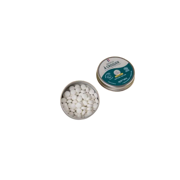Pour information : le dentifrice à croquer est fabriqué avec des cristaux de menthol réduit en poudre. Ces cristaux ont tendance à se recristalliser lorsque les pastilles à croquer sont placées dans une pièce froide et humide. Ce phénomène naturel n’entrave en rien le goût, la qualité et l’efficacité du produit.