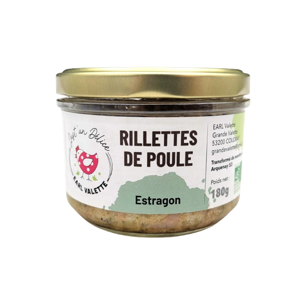 Des rillettes de poule natures BIO, provenant de l'EARL Valette, fabriquées de manière artisanale à Arquenay en Mayenne.