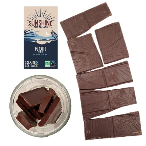 Goûtez la fleur de sel née des embruns bretons. Une pointe aromatique minime, mais vivifiante qui fait des merveilles avec le chocolat noir. Tablette BIO et équitable.