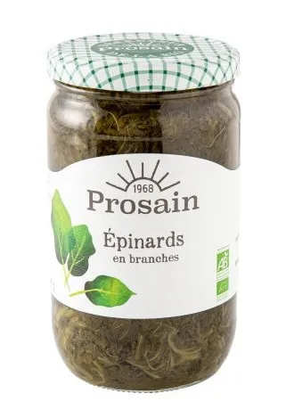 Une conserve d'épinards cultivés en biodynamie (certifiés Demeter) : les feuilles entières ont été mises en bocal fraîches, juste après leur récolte