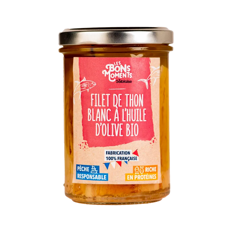 Filets de thon germon (Thunnus alalunga pêché en Océan Atlantique) 78%, huile d’olive (UE/non UE) 21%, sel, poivre noir*, laurier*. * Ingrédients issus de l’Agriculture biologique. 21,3% des ingrédients sont issus de l’agriculture biologique.