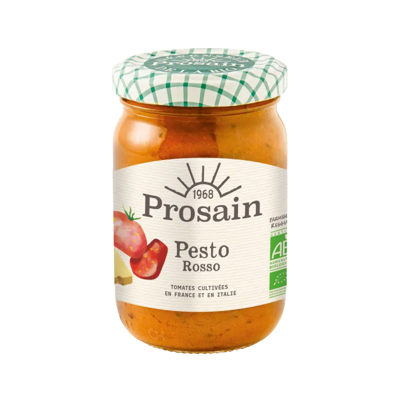 Tomate* 29% (cube*, double concentré*), huile d’olive* vierge extra extraite à froid, tomates mi-séchées* 16%, huile de tournesol* désodorisée, basilic* 5%, noix de cajou* 3%, fromage* Parmigiano Reggiano AOP (lactose) 3%, graines de tournesol* 2%, vinaigre de vin blanc*, sel de mer, ail*. *Ingrédients issus de l’agriculture biologique