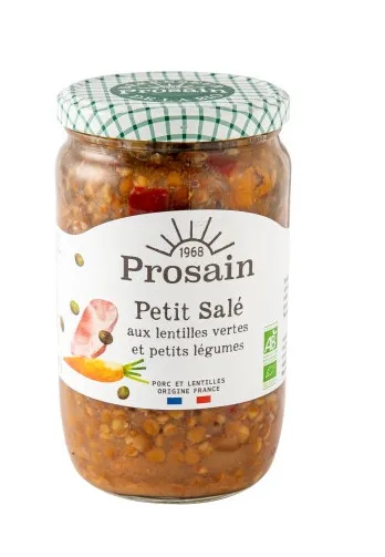 Eau, petit salé* 25% minimum (épaule de porc*, poitrine fumée de porc*, eau, sel, sirop de glucose*, sucre de canne*, antioxydant : acide ascorbique, épices*, huile essentielle de poivre*), lentilles vertes* 24%, oignons*, carottes* 7%, couenne de porc*, graisse de canard*, sel de mer, concentré de tomates*, oignon* poudre, épaississant (gomme xanthane), ail* poudre, thym*, poivre*.