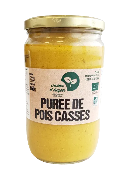 Une purée de pois cassés en conserve, pratique, artisanale, bio et locale, à réchauffer doucement à la casserole.