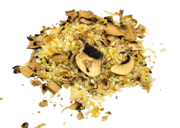 Riz rond blanc*, champignon*, oignons*, ail*, bouillon (sel de mer, farine de riz*, oignon*, ail*, carotte*, épices*(avec CELERI*), persil*, huile de tournesol*), carotte, persil*. *Issus de l’agriculture biologique