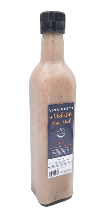 Une vinaigrette à l'échalote et au miel locale élaborée de façon artisanale avec un vinaigre qui a macéré en barrique afin de préserver la qualité gustative des ingrédients.