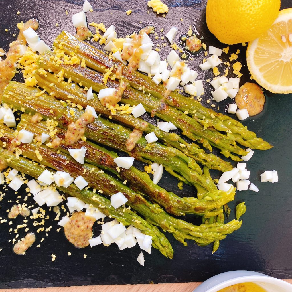 Rôtir les asperges à la poêle 5 minutes avec un peu d’huile d’olive.