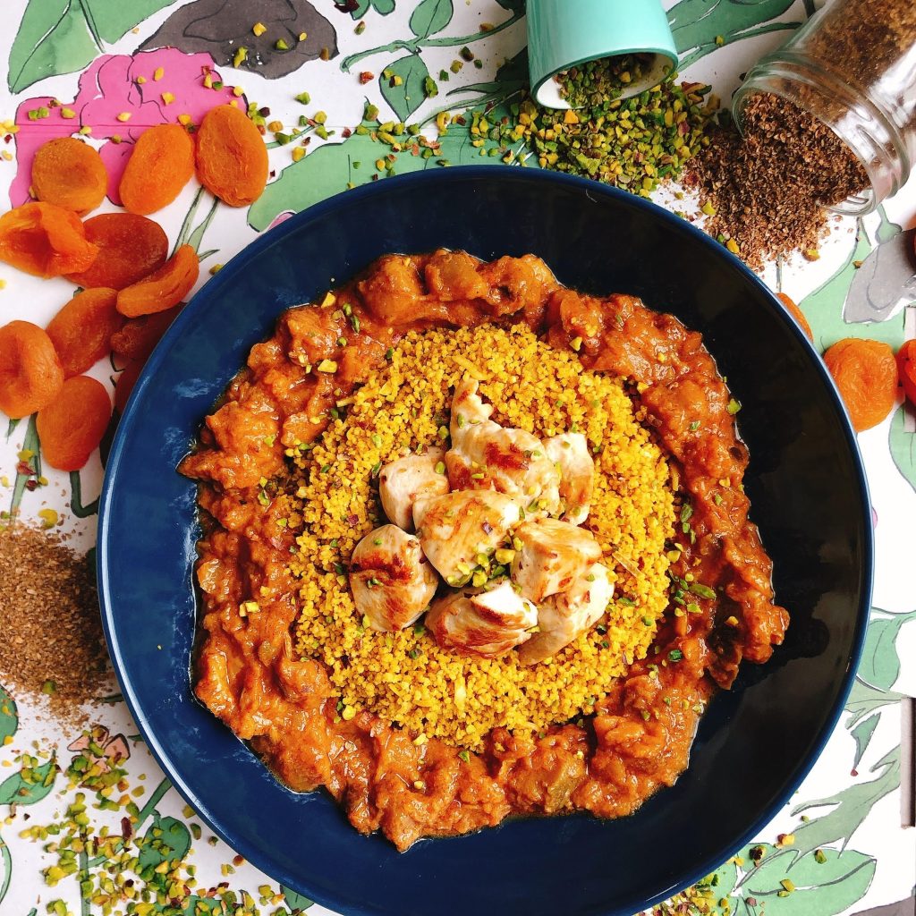 Dans une assiette déposer la semoule, le poulet et le curry d’aubergines.