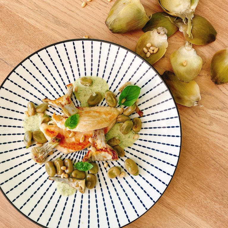 Une délicieuse recette de poulet accompagner de ses artichauts de saison.