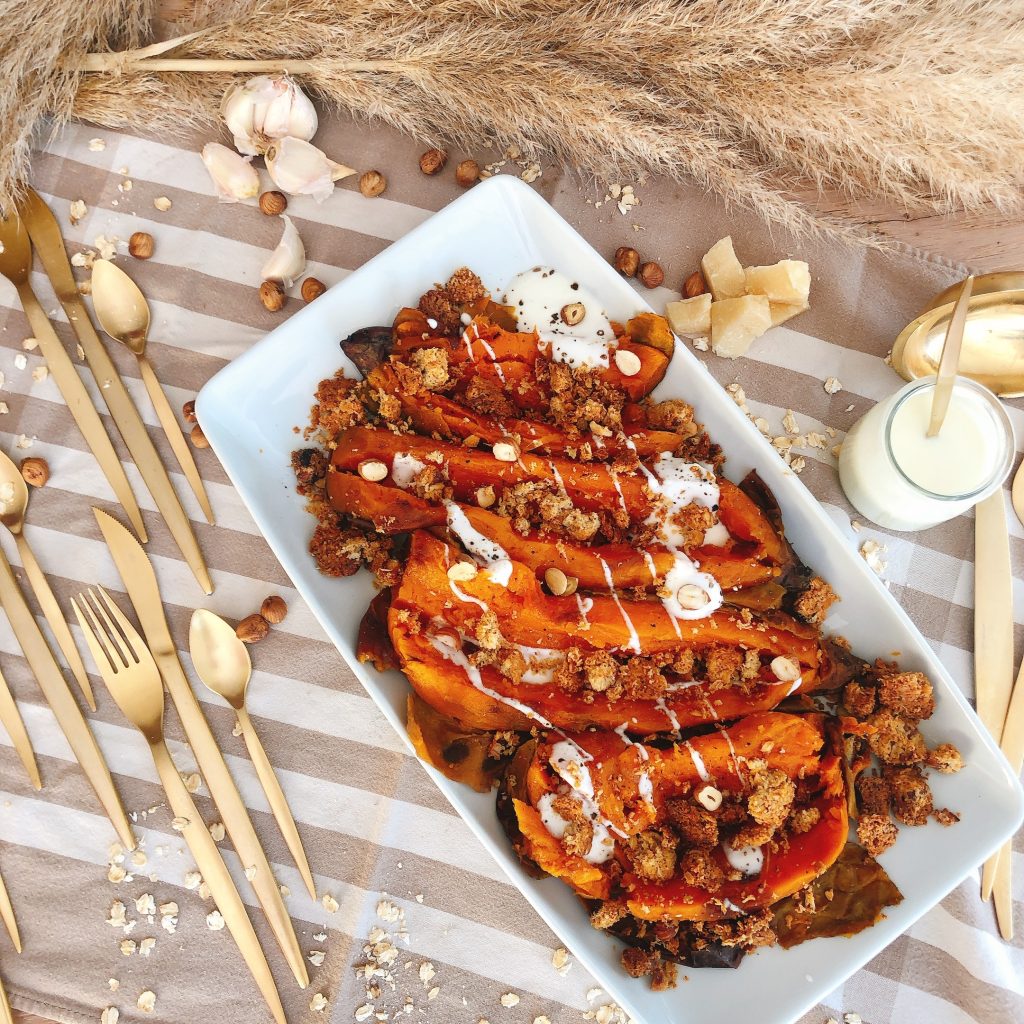 Des patates douces fondantes nappées d'un crumble croustillant au parmesan et d'une sauce yaourt à l'ail. Simple et réconfortant !