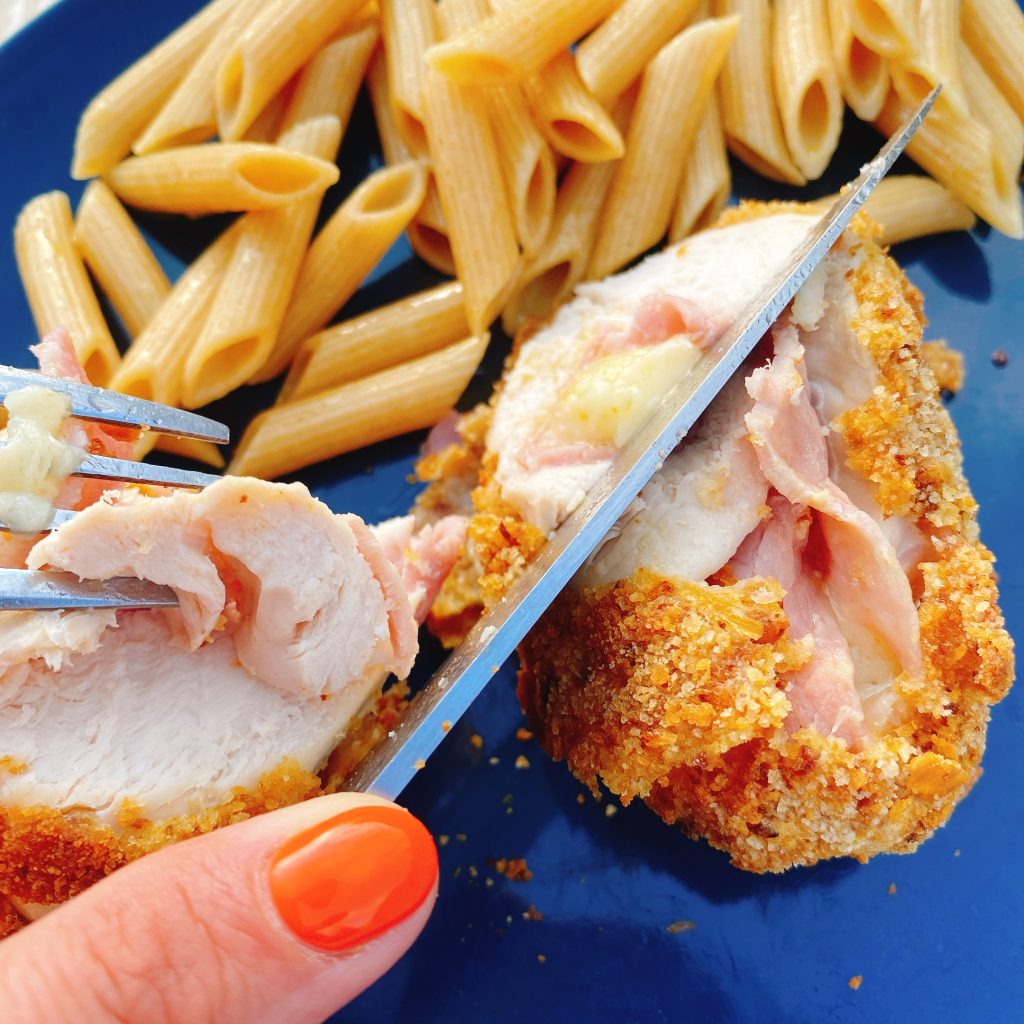 Couper les filets de poulet en 2 pour les ouvrir. Déposer par dessus une belle tranche de jambon et des bâtonnets de gruyère. Rouler et ficeler avec de la ficelle.